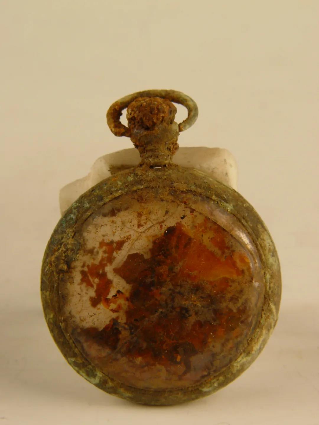 這隻懷表於1971年從撫順平(píng)頂山慘案遺址出土,表(biǎo)蒙(méng)有明顯(xiǎn)的裂痕,表盤內已(yǐ)經(jīng)沒有指針。雖然鏽蝕嚴重,但仍能看到被火燒過的痕(hén)跡。這隻沒有指針的(de)懷表,凝固了時間,也凝固了侵華日軍(jun1)的滔天罪行。